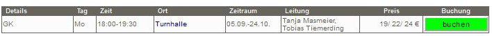 | | Keine Anmeldung möglich. Im Zweifel bitte im Hochschulsportbüro nachfragen. |