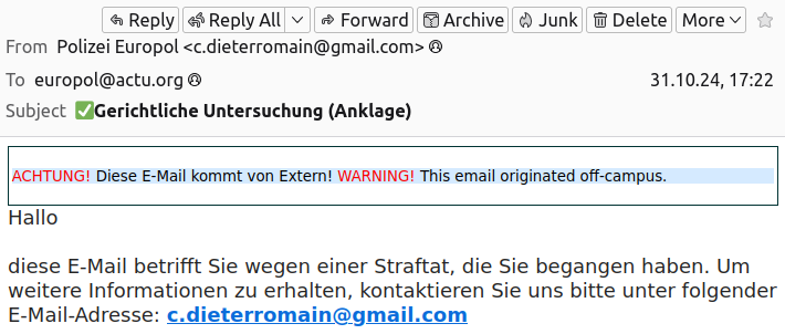 Wenn Sie unerwartet E-Mails von intern oder extern erhalten, so vergewissern Sie sich bitte bei diesen durch ein kurzes Telefonat, ob die E-Mail von denen kommt.