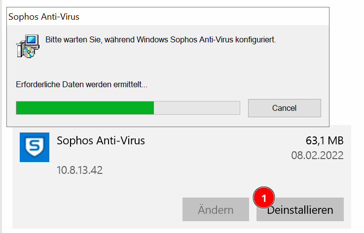 - Deinstallieren Sie alle Sophos Programme (besuchen Sie "Programme hinzufügen oder entfernen") und klicken Sie "Deinstallieren" (Lässt sich "Sophos Endpoint Defense" nicht entfernen kann man das ignorieren)