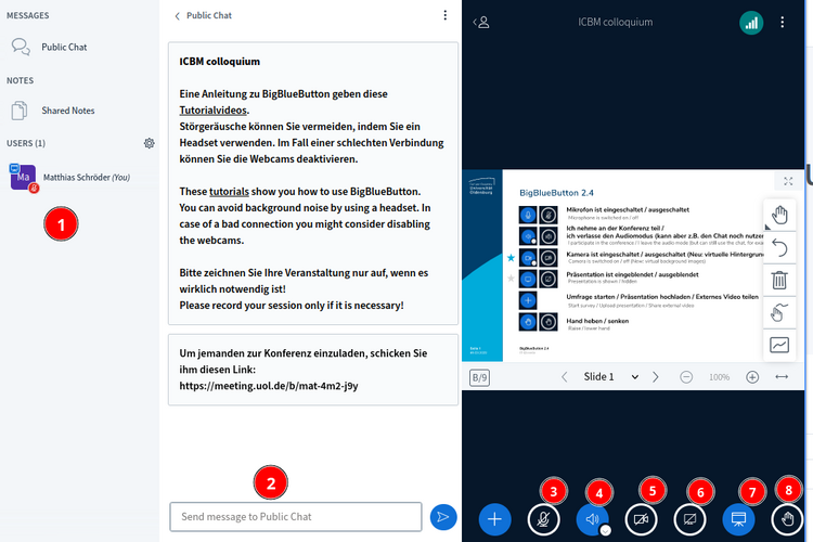 We use the video conference system BBB (BigBlueButton) for the online broadcasting to enable you to hear ans see the speaker and the slides. Interaction is possible via Chat or by using your microphone. Normally only Speaker and Host activate their camera.