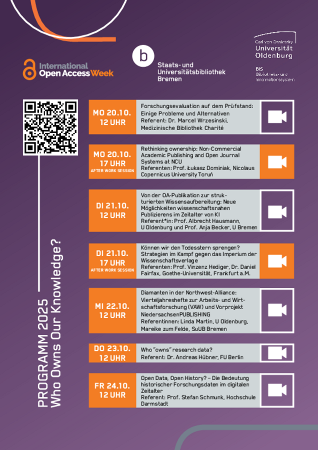 - 12 Uhr: Prof. Dr. Albrecht Hausmann von der Universität Oldenburg und Prof. Dr. Anja Becker von der Universität Bremen: "Von der Open-Access-Publikation zur strukturierten Wissensaufbereitung mit neuen Möglichkeiten wissenschaftsnahen Publizierens im Zeitalter von KI”