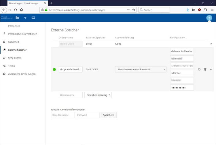 Cloud-Storage verfügt über eine Webschnittstelle, über die Nutzer auf ihre Daten zugreifen und diese mit anderen Nutzern teilen können. Das Webinterface ist unter cloud.uol.de erreichbar.