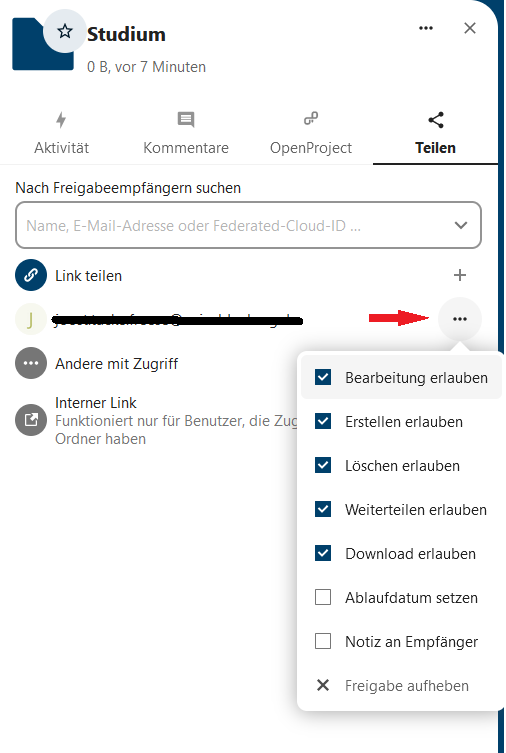 Soll der hinzugefügte Nutzer der Universität auch Dateien auf Ihr Verzeichnis hochladen dürfen, so fahren Sie mit dem Mauszeiger über dessen E-Mail-Adresse und setzten das Häkchen für „kann bearbeiten“.
