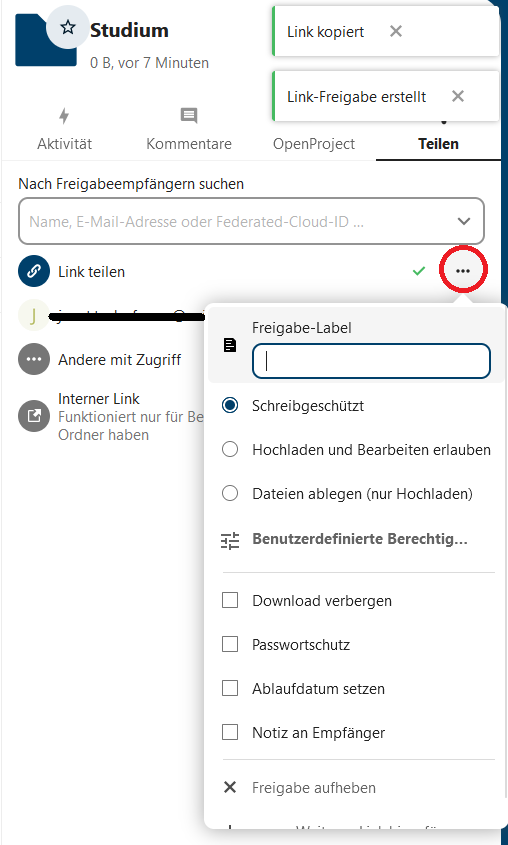 Ist der Nutzer kein Mitglied der Universität Oldenburg, so können Sie über die Funktion „Über einen Link freigeben“ Dateien und Ordner teilen.