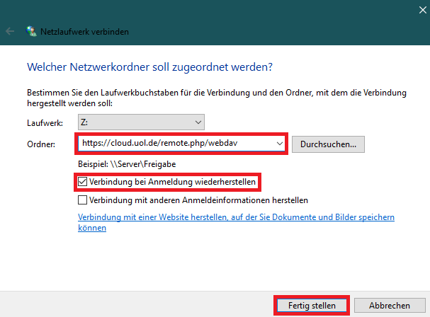2. Tragen Sie als Ordner die Adresse https://cloud.uol.de/remote.php/webdav ein. Sie können noch auswählen, ob die Verbindung bei der nächsten Anmeldung wiederhergestellt oder unter welchem Laufwerksbuchstaben Ihr Cloud-Storage dargestellt werden soll. Bestätigen Sie diesen Dialog mit "Fertig stellen".
