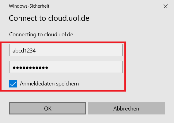 3. Es erscheint ein neues Fenster zur Eingabe Ihrer Zugangsdaten. Sie können Windows anweisen, dass Ihre Zugangsdaten gespeichert werden sollen. Bestätigen Sie mit "OK".