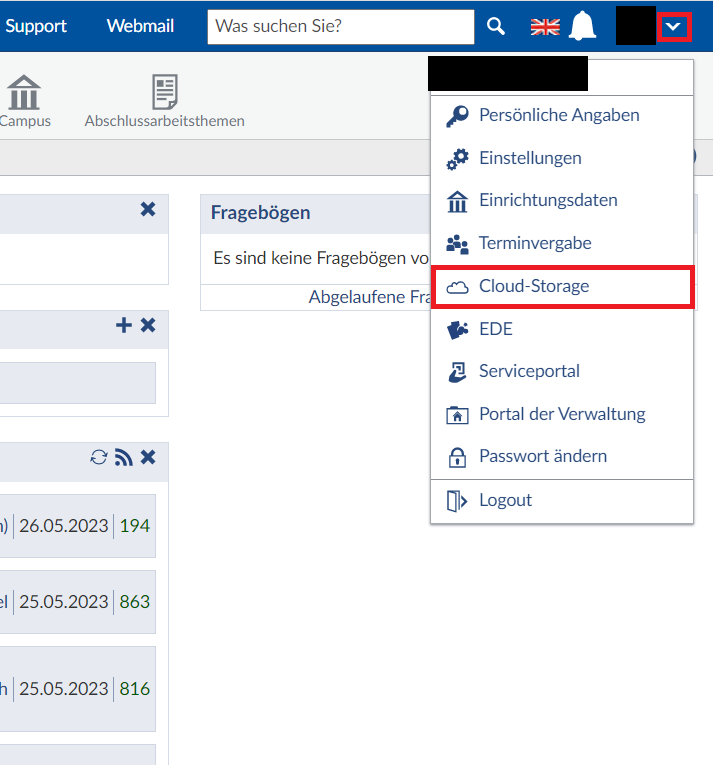 4. Klicken Sie oben rechts auf Ihren Namen und verlassen Sie die Applikation unter "Abmelden".