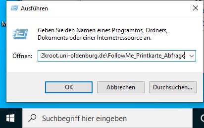 Fügen Sie \\ricohmfg01.w2kroot.uni-oldenburg.de\FollowMe_Printkarte_Abfrage in das Feld neben „Öffnen:“ ein und führen es mit „OK“ aus.