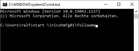 Geben Sie „start \\ricohmfg01.w2kroot.uni-oldenburg.de\followme“ in dem schwarzen Fenster, gefolgt mit der „Return“ Taste ein.
