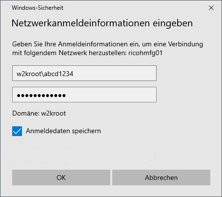 Es erscheint das Fenster „Windows-Sicherheit“. Geben Sie Ihr Nutzerkonto mit vorangestelltem w2kroot\ und das Kennwort ein.