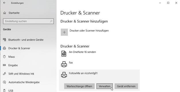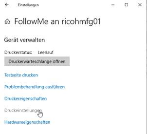 Rufen Sie die Geräte- und Druckerverwaltung auf und klicken auf „Verwalten“ des gerade hinzugefügten FollowMe-Druckers auf.