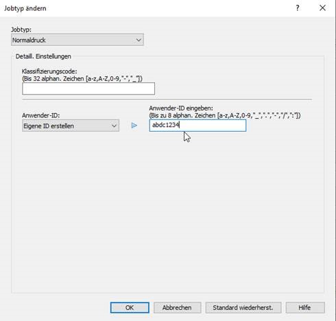 Wählen Sie bei „Anwender-ID:“ den Eintrag „Eigene ID erstellen“ aus und geben im Eingabefeld „Anwender-ID eingeben:“ ihre Nutzerkennung ein (abcd1234). Bestätigen Sie die Eingabe mit einem Klick auf die Schaltfläche „Ok“. Danach schließt sich das Fenster. Ihre Eingaben bestätigen Sie bitte noch mit einen Klick auf die Schaltfläche „Übernehmen“.