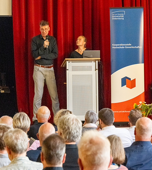 An der Festveranstaltung am 5. September 2024 nahmen ca. 150 Gäste aus Bildungswesen, Gewerkschaften, Wirtschaft, Politik und Gesellschaft in der Aula der Carl von Ossietzky Universität Oldenburg teil.