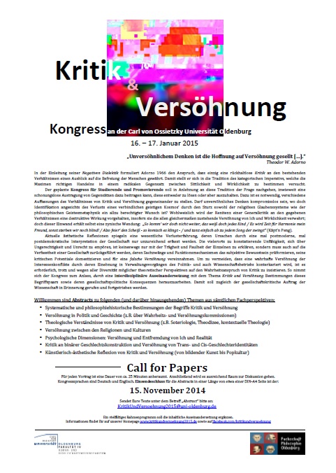 Der geplante Kongress für Studierende und Promovierende soll in Anlehnung an diese Tradition der Frage nachgehen, inwieweit eine schonungslose Austragung von Gegensätzen dazu beitragen kann, diese entweder zu lösen oder aber auszuhalten. Dazu ist es notwendig, verschiedene Auffassungen des Verhältnisses von Kritik und Versöhnung gegeneinander zu stellen. Darf unversöhnliches Denken kompromisslos sein, wo doch Identifikation angesichts des Verlusts eines verbindlichen geistigen Kosmos‘ durch den Sturz sowohl der religiösen Glaubenssysteme wie der philosophischen Geistesmetaphysik ein allzu berechtigter Wunsch ist? Wohlweislich wird der Renitenz einer Generalkritik an den gegebenen Verhältnissen eine destruktive Wirkung vorgehalten, insofern sie die allen gleichermaßen zustehende Versöhnung von Ich und Wirklichkeit verwehrt; doch dieser Einwand erhält selbst eine zynische Wendung: „So komm‘ wir doch nicht weiter, das weiß doch jedes Kind / Es wird Zeit für Harmonie mein Freund, sonst sterben wir noch blind! / Also feier‘ den Scheiß - so komisch es klingt - / und tanz einfach ab zu jedem Song der swingt“ (Käpt’n Peng).