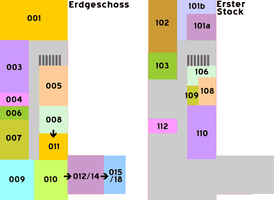 | Erdgeschoss 001 - Seminar 003 - Holzwerkstatt 004 - Gast 005 - freiraum 006 - Werkstattbüro Wallach 007 - Hochdruck 008 - Buchdruck 009 - Siebdruck 010 - Praxisarbeitsraum 011 - Hochdruck 012/14 - Reprotechnik 015/18 - Fotolabor | Erster Stock |