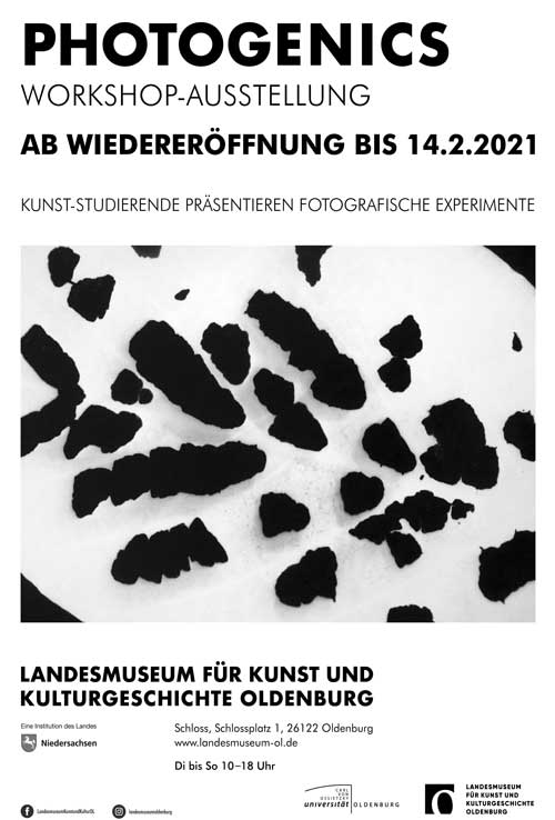 Die Subjektive Fotografie, die in der 1949 gegründeten Gruppe fotoform ihr Zentrum fand, hat die kreativen Möglichkeiten der Fotografie in der Nachkriegszeit um wesentliche Ansätze erweitert. Otto Steinert, Siegfried Lauterwasser, Peter Keetman, Heinz Halke-Hajek ebenso wie Kilian Breier haben mit fotografischen Techniken experimentiert, Wirklichkeit neu gedeutet und interpretiert. Sie haben über Negativabzüge, Fotogramme oder Chemigramme autonome Bildwelten geschaffen, die sich z.T. vollständig von der empirisch erfahrbaren Wirklichkeit lösen und bis in die Abstraktion gehen. Arbeiten der genannten Künstler, die in der Ausstellung Schupmann Collection – Fotografie in Westdeutschland im Schloss zu sehen sind, waren Impuls für die Kunst-Studierenden. Innerhalb eines Semesters lernten sie Fotografie neu kennen und konnten unterschiedliche Techniken ausloten, um ohne Kamera, ohne Negativ, in der Dunkelkammer zu experimentieren. So wurde die Bilderzeugung zur Bilderfindung. Gearbeitet wurde auf der Basis fotografischer Materialien mit lichtempfindlichem Schwarzweiß-Fotopapier, Fotochemikalien sowie den nötigen Lichtquellen. Das Licht selbst wurde zum Bildgegenstand: Es kann gebrochen und gelenkt werden oder wie ein Pinsel Spuren auf lichtempfindlichem Material hinterlassen. Diese unendliche Vielfalt der gestalterischen Möglichkeiten zeigt sich in der Workshop-Ausstellung Photogenics.