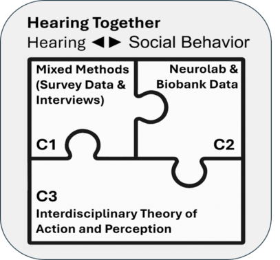 There is substantial evidence for a bidirectional relationship between hearing and social context, particularly evident in individuals with hearing loss (HL). But the mechanisms driving HL-related social exclusion and loneliness are not well understood, particularly regarding the impact of loss of nuance in understanding social and emotional cues. Do individuals withdraw socially because HL makes engaging with social contacts too difficult and frustrating? Or do misunderstandings and lack of attention to socioemotional cues lead to conflict, destabilizing social ties? What types of social networks can mitigate these negative effects? And what mediating role does subjective loneliness play? Furthermore, what neurophysiological processes modulate these social interactions, and how can understanding these processes improve hearing aid algorithms to enhance social functioning and increase hearing aid uptake? These and related questions will be explored in this interdisciplinary project. In the first project component (C1), we use quantitative and qualitative survey data to investigate the connections between hearing, social networks, and social support. In the second project component (C2), we examine the interplay between HL and neural networks linked to social behavior. In the third project component (C3), we develop an interdisciplinary theoretical framework that draws on sociological action theories and the active inference framework from theoretical neuroscience to support the empirical components. All project components will inform each other throughout the project to develop a socio-neuroscientific perspective on hearing and social behavior.