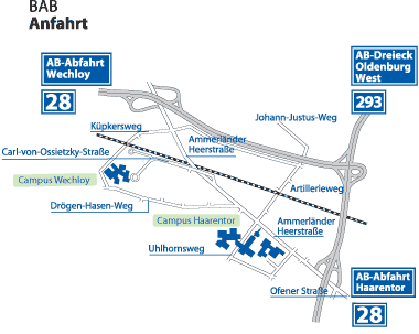 Fahren Sie zunächst genau so wie oben beim Zentralbereich beschrieben. Biegen Sie jedoch nicht links in den Uhlhornsweg ein, sondern fahren Sie weiter auf der Ammerländer Heerstraße geradeaus. Nach ca. 500 Metern biegen Sie rechts ab auf die Carl-von-Ossietzky-Straße (siehe Hinweisschild) und fahren diese bis zum Ende durch. Zur Orientierung: Die genannte Abbiegung befindet sich vor einer Brücke, die die Sie im Verlauf der Carl-von-Ossietzky-Straße überqueren.