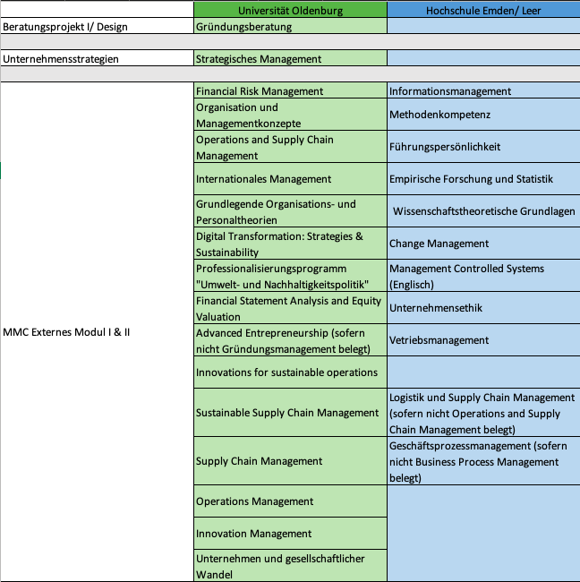 - Weitere Module aus den Curricular der Universität Oldenburg, Hochschule Emden/Leer sowie im Rahmen von Auslandssemestern erworbenen ECTS können auf Sondereinzelantrag anerkannt werden