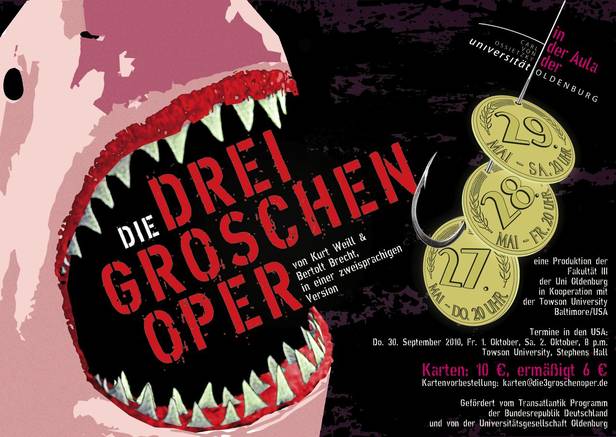 Neben der Herausforderung dieser Kooperation stehen die Studierenden aus Oldenburg und Towson aber auch vor dem Reiz des Brechtschen Stoffs und der Musik Weills. Da fragt man sich immer wieder: Ist die Dreigroschenoper veraltet? Oder findet die einmalige Musik und die „Moral von der Geschicht“, die Kritik an der Gesellschaft, auch heute noch Einzug in die Köpfe der Zuschauer? Ist dieser Brechtsche Pessimismus an der Welt altmodisch und realitätsfern oder deutlicher als erwünscht? Entstanden kurz vor der Weltwirtschaftskrise von 1929 ist die Dreigroschenoper vielleicht gerade in der heutigen Zeit so aktuell wie nie zuvor. Denn: „Die Welt ist arm, der Mensch ist schlecht. Da hab ich eben leider recht!“