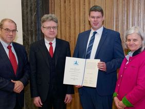 Die Preisverleihung fand auf der diesjährigen Bunsen-Tagung in Leipzig statt. Das Foto zeigt (von links): Prof. Dr. Rolf Hempelmann, Vertreter der Ewald Wicke Stiftung; Prof. Dr. Robert Franke, 1. Vorsitzender der DBG; Dr. Lars Mohrhusen und die Laudatorin Prof. Dr. Katharina Al-Shamery von der Universität Oldenburg.