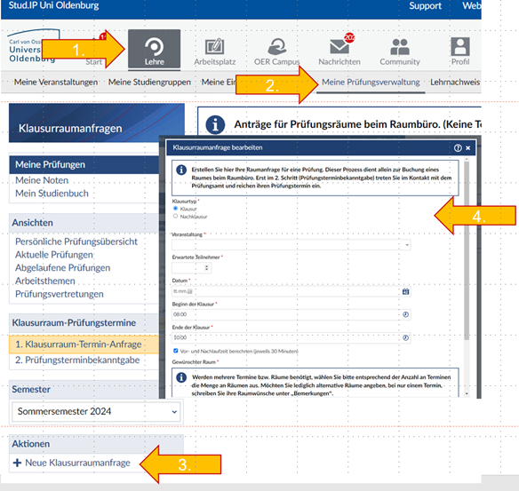 Bitte beachten Sie: Es werden über dieses Tool lediglich die Veranstaltungsräume vergeben. Die Übermittlung der Prüfungstermine an das Akademischen Prüfungsamt über die „Prüfungsterminbekanntgabe“ ist weiterhin wie gehabt notwendig.