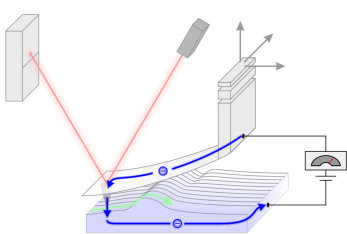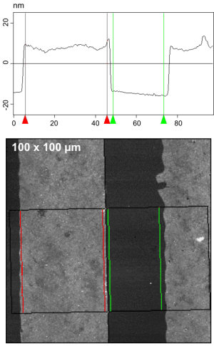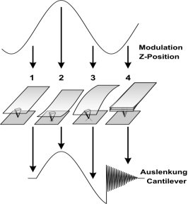 Zur Bestimmung der Topographie werden in unserer Gruppe der Kontaktmodus (contact mode) und ein als Tapping Mode (mögliche Übersetzungen Abklopfmodus/ intermittierender Kontaktmodus) bezeichneter Messmodus verwendet. Im Kontaktmodus wird die Messspitze in direkten Kontakt mit der Probe gebracht. Der Anpressdruck wird durch die Verformung des Cantilevers erfasst und beim Abrastern der Probe durch eine Rückkopplungsschleife konstant gehalten.