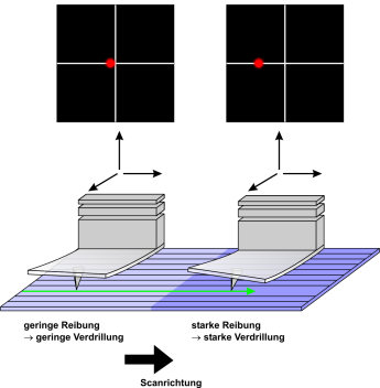Der Lateral Force Mode (Reibungskraftmmodus) ist eine Variation des Kontaktmodus. Die schnelle Scanrichtung wird um 90° gedreht, so dass der Cantilever senkrecht zu seiner Ausrichtung bewegt wird. Infolgedessen wird der Cantilever durch Reibungskräfte zwischen Messspitze und Probe verdrillt. Je nach "Klebrigkeit" der Probe variiert die Verdrillung, die durch einen viergeteilten Fotodetektor aufgezeichnet wird. Aus diesen Daten wird ein Abbild der lokalen Reibungskräfte erstellt.