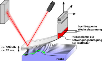 Im Tapping Mode wird der Cantilever durch eine zusätzliche Piezokeramik, an die eine hochfrequente Wechselspannung (ca. 10-500 kHz) angelegt wird, nahe seiner Resonanzfrequenz in Schwingung versetzt. Bei Annäherung an die Probe verringert sich die Amplitude der Schwingung durch Wechselwirkungen zwischen Probe und Messspitze. Eine Rückkopplungsschleife hält bei der Bewegung über die Probe die Amplitude durch Variation der z-Position konstant, so dass topographische Informationen über die Probe erhalten werden. Beide Messmodi können unter atmosphärischen Bedingungen, im Vakuum und in Flüssigkeit betrieben werden.