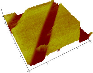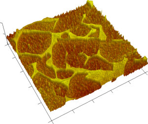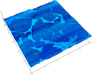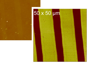 Hintergrundinformationen und Details zu diesem Experiment und zu dieser Probe: S. E. Pust, D. Scharnweber, C. Nunes Kirchner, G. Wittstock; Heterogeneous Distribution of Reactivity on Metallic Biomaterials: Scanning Probe Microscopy Studies of the Biphasic Ti Alloy Ti6Al4V. Adv. Mater. 2007, 19, 878-882. Abstract & Link