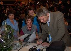 Die anschließenden Fragen aus dem Publikum wiesen ebenso eine große Bandbreite auf: Sie beschäftigten sich z.B. mit denKosten der Raumfähren oder ob man nur als Mitglied der Bundeswehr an einer solchen Mission teilnehmen könne bis hin zur bedeutenden Frage: „Gibt es an Bord der ISS auch Internet?“