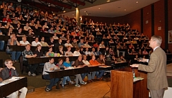 Die Sitzplätze im großen Hörsaal in Wechloy reichten nicht aus, um allen interessierten Zuhörern Platz zu bieten, als der ehemalige Astronaut Thomas Reiter im Rahmen des Physik-Kolloquiums über seine Arbeit im Weltraum berichtete. Ein halbes Jahr lang war der Luft- und Raumfahrtingenieur als dritter im Bunde auf der internationale Raumstation ISS im Einsatz. Gebannt lauschte das überwiegend junge Publikum den zum Teil sehr amüsanten Schilderungen von Thomas Reiter, der sehr anschaulich schilderte, wie ein Lebensalltag im Weltraum aussieht. Mittels beeindruckender Videosequenzen und Fotos von der europäischen Mission Astrolab im Jahre 2006 berichte er von seinem Ausflug ins Weltall, den er als bisher einziger deutscher Astronaut unternommen hat. „Das war allerdings alles andere als ein Spaziergang. Denn jede kleinste Bewegung im Raumanzug kostet unter den Druckverhältnissen des Weltraums enorme Kraft, da muss vorher jeder Handgriff klar und vielfach geübt sein“, erzählt Reiter. Neben Reparaturarbeiten und Installationen von neuen technischen Geräten blieb Reiter und seinem Kollegen genügend Zeit, um atemberaubende Blicke auf die Erde zu werfen. Faszinierend waren dann auch seine Bilder der Nachtseite der Erde, die erhellt wurde von Gewitterblitzen und den Lichtern der Millionen-Städte. Alle neunzig Minuten habe die Raumstation ISS mit einer Geschwindigkeit von 28.000 Stundenkilometern die Erde umrundet. Während seines 142 Tage dauernden Aufenthalts hat Reiter insgesamt 19 wissenschaftliche Experimente aus den Bereichen Humanmedizin, Physik und Biologie unternommen, die zuvor minutiös geplant waren und kaum Abweichungen vom jeweiligen durchstrukturierten Tagesplan erlaubten Die Aufgaben umfassten beispielsweise Experimente von Schülern als auch die Erprobung von Materialien, die künftig beim Bau von Satelliten Verwendung finden könnten.