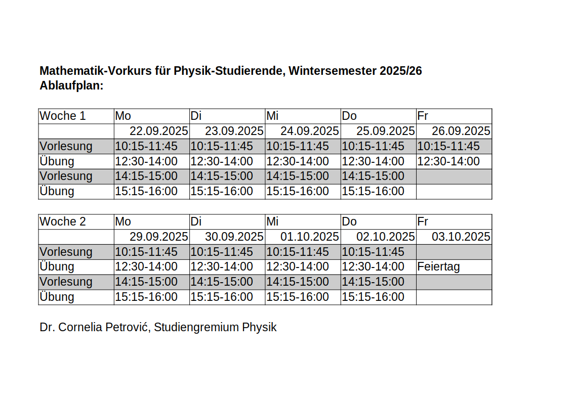Achtung: Den Studienanfänger:innen im Fachbachelor Physik empfehlen wir alternativ die Teilnahme an dem parallel stattfindenden Mathematik-Vorkurs, den die Fachschaft Mathematik und Elementarmathematik anbietet: Vorbereitungskurs Mathematik der Fachschaft Mathematik und Elementarmathematik. Start ist hier am Dienstag(!), dem 23.09.2025, 09:00 Uhr, im Raum W03 1-161.