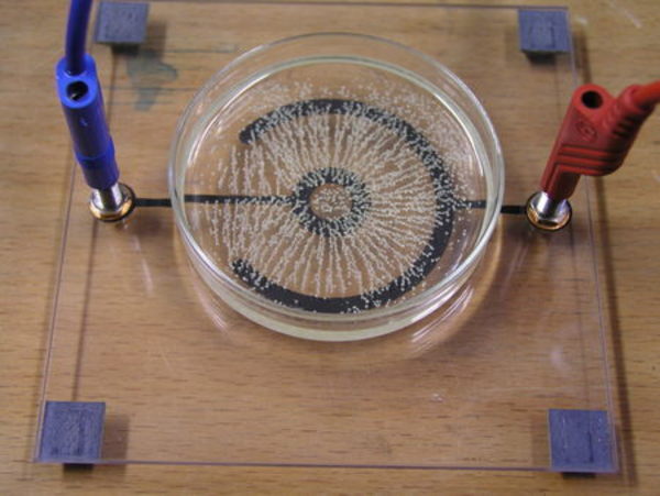 Feldlinien des Elektrischen Feldes werden durch Gries in Öl an verschiedenen Feldkonfigurationen visualisiert.