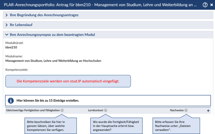 Für die Beschreibung Ihrer Fähigkeiten können Sie in der Anrechnungssynopse bis zu 15 Einträge erstellen. Jedem Eintrag ordnen Sie entsprechende Nachweise zu, aus denen eindeutig hervorgeht, dass Sie über die im jeweiligen Eintrag beschriebenen Fertigkeiten und Fähigkeiten verfügen. Verweisen Sie gegebenenfalls auf konkrete Seiten in den Belegen bzw. markieren entsprechende Absätze. Pro Eintrag können Sie maximal zwei authentische Belege (individuelle Nachweise und Curricula) und zwei Zeugnisse/Zertifikate nennen.