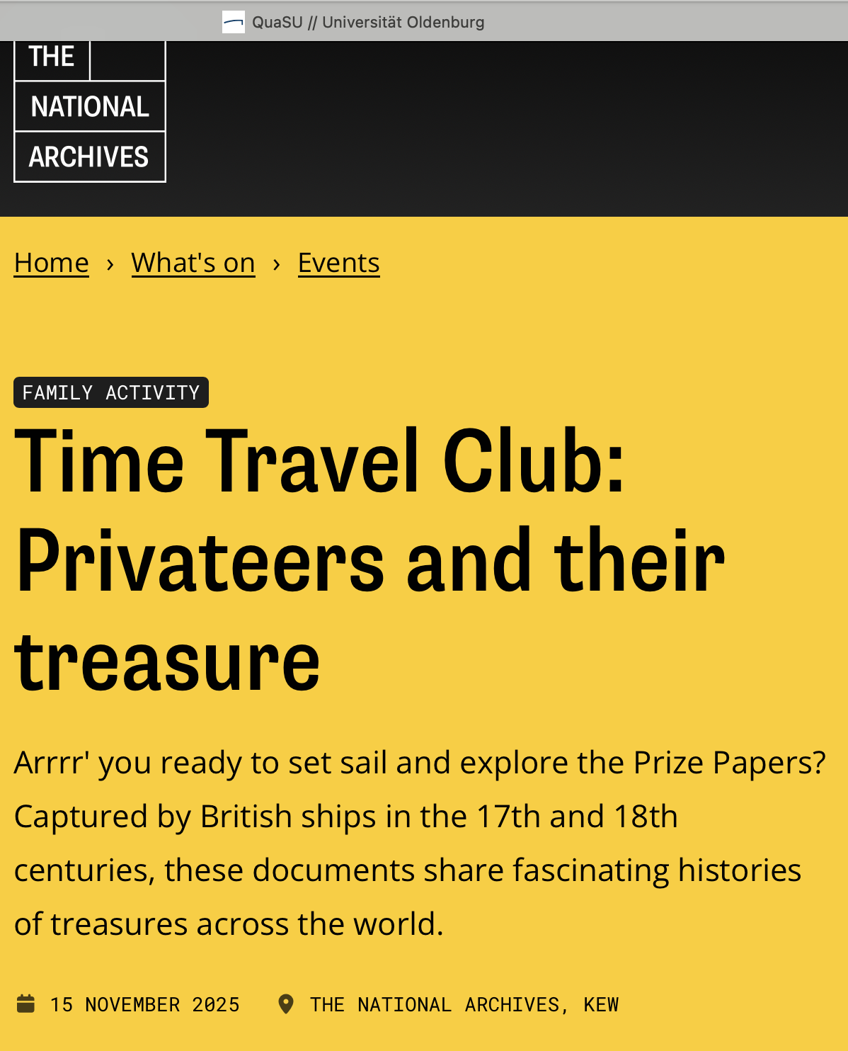 mehr: Safe the Date: 15.11.25 Family Workshop at The National Archives (London, Kew) Time Travel Club: Privateers and their treasureKinderCampus am 20.9.25: QuaSU zum Mitmachen (Foyer Gebäude A14)