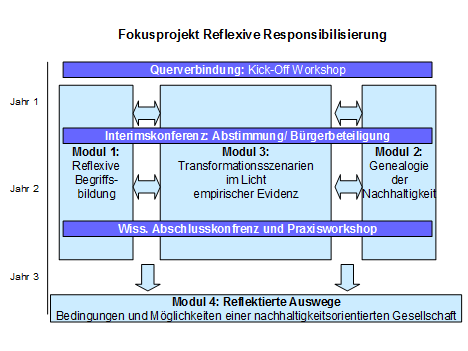 bilden die systematisch in Austausch gebrachten Säulen des Projekts, die auf das Ziel des reflexiven Vergleichs von Postulaten und Konsequenzen nachhaltigkeitsorientierter Verantwortungszurechnung (Modul 4: reflektierte Auswege) hinführen.