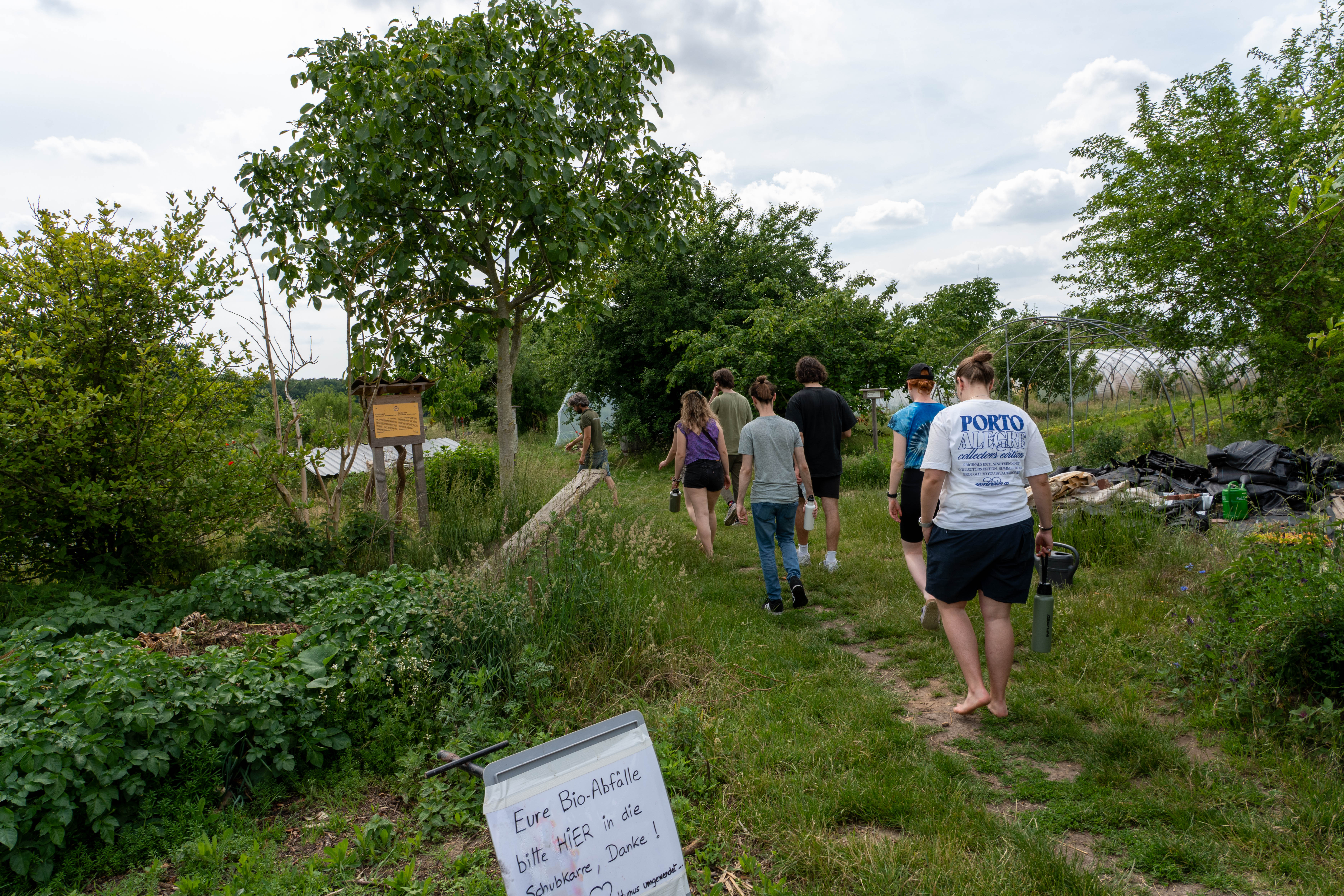 Das erste Projekt, das wir erkunden durften, war der Permakulturpark (PaLS), den uns Jonas – der dort als Gärtner arbeitet – vorgestellt hat. Der Permakulturpark umfasst eine Fläche von acht Hektar, die zuvor größtenteils für konventionellen Maisanbau genutzt wurde. Um auf dem sandigen, ausgelaugten Boden wieder eine Vielfalt an Pflanzen wachsen zu lassen, besteht eine der zentralen Aufgaben darin, mit Hilfe von Kompost und Terra Preta eine nährstoffreiche Erde aufzubauen. Auf dieser wird inzwischen für die angeschlossene SoLaWi Gemüse angebaut – und zwar nach den Prinzipien der Permakultur, die darauf abzielt, natürliche Kreisläufe nachzuahmen.
