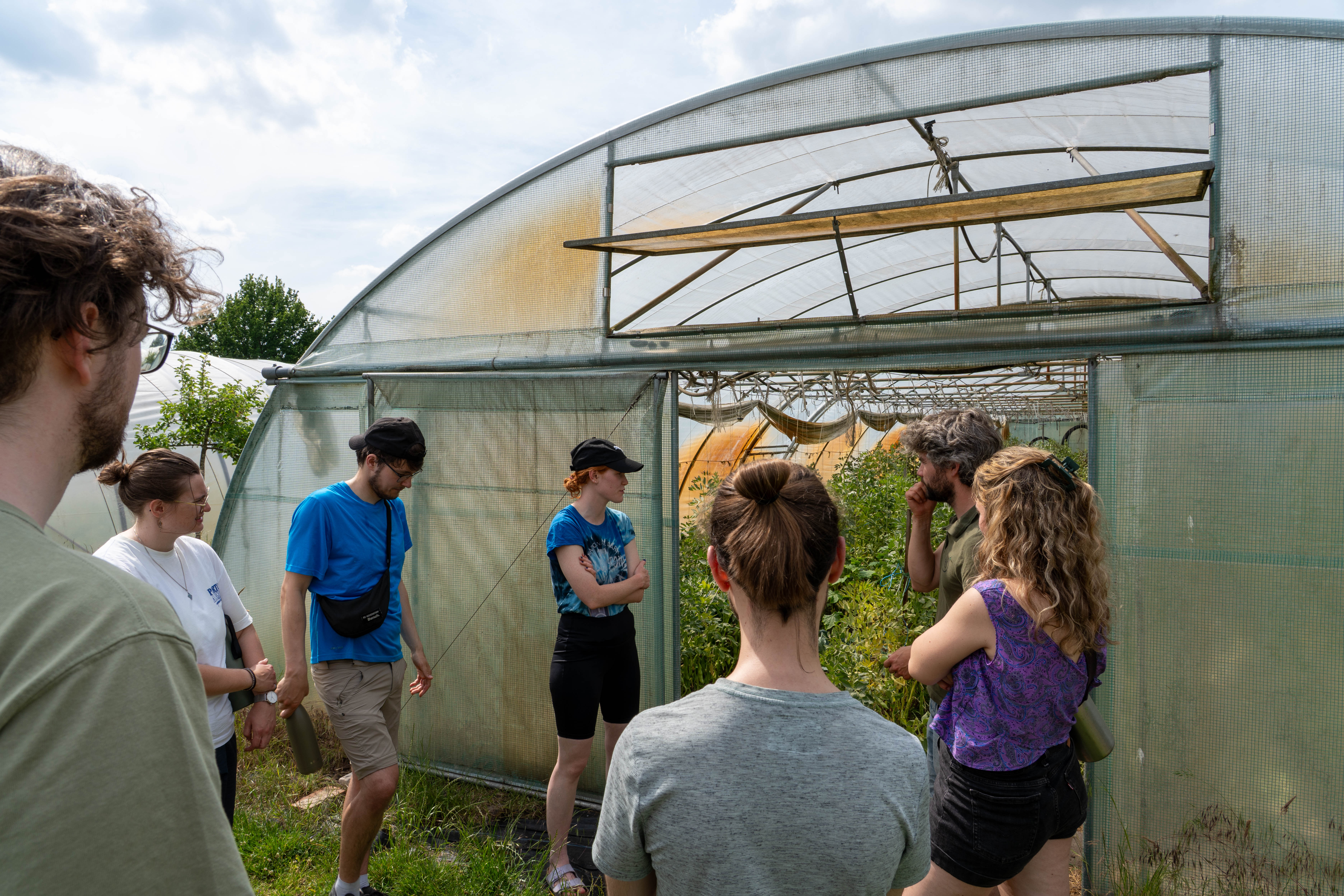Sichtbar wird das zum Beispiel in der Gestaltung der Beete: Baumreihen wechseln sich mit Anbauflächen ab, und selbst innerhalb der Beete wachsen verschiedene Pflanzenarten nebeneinander. In einem der Gewächshäuser fanden wir Kohlrabi, Mangold und Bohnen wild durcheinander – ein lebendiges Beispiel für Mischkultur. Jonas gab uns spannende Einblicke in die zahlreichen Experimente und Ansätze, die hier erprobt werden.