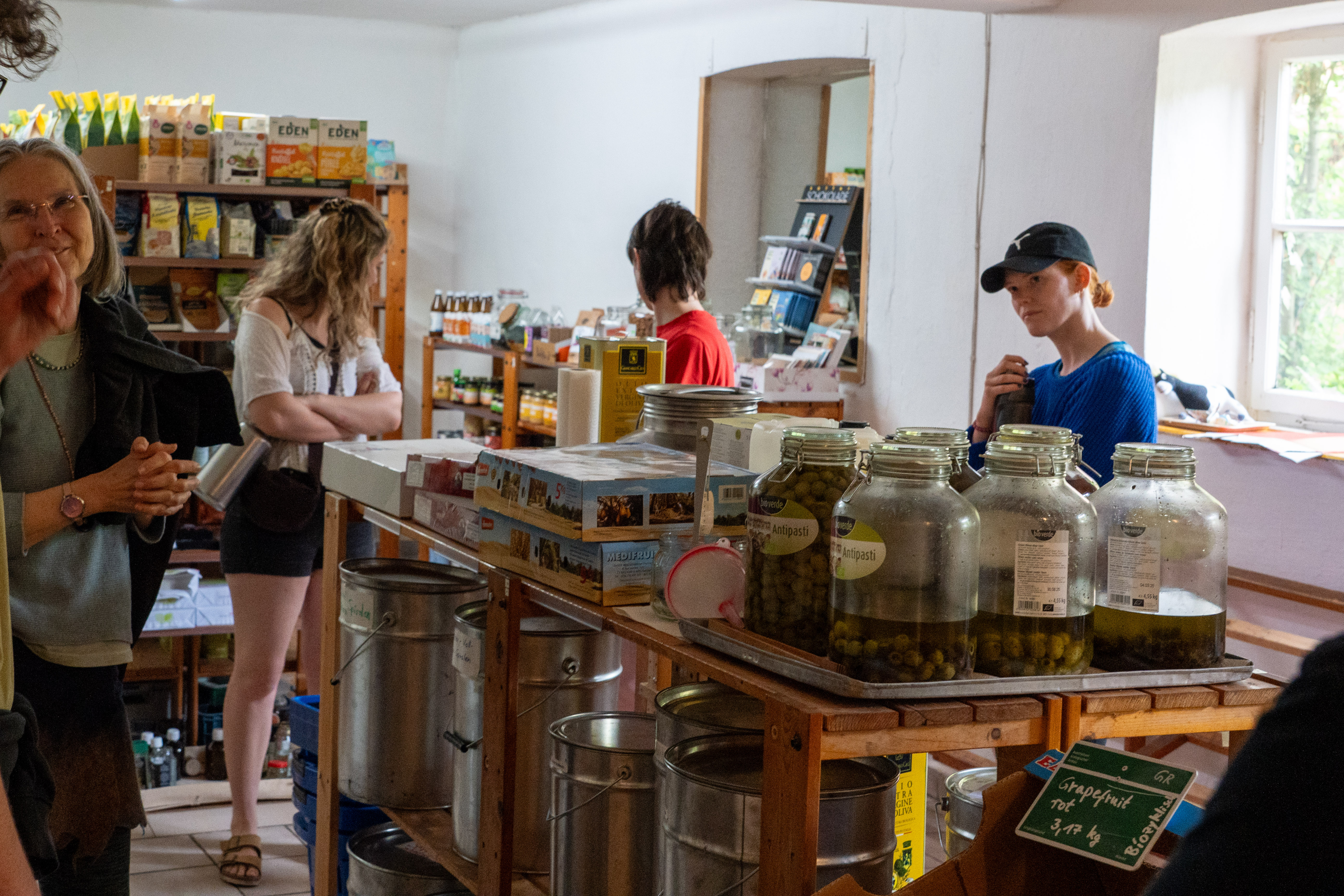 Neben diesen beiden – inzwischen eigenständig gewordenen – Projekten hat uns Ute noch Einblicke in die Gemeinschaft des Lebensgartens und die Arbeit des zugehörigen Vereins gegeben. Vor 40 Jahren gegründet, vereint dieser Ort eine Vielzahl weiterer Initiativen und Ansätze. So ist hier etwa das Zentrum für Gewaltfreie Kommunikation angesiedelt, und mit der KulturKüche gibt es einen Raum für verschiedene Kulturveranstaltungen. Auch sonst ist einiges geboten: vom morgendlichen Tanzkreis im Dorfzentrum bis hin zur Teezeremonie. Ein weiterer Stopp auf unserer Tour war der gemeinschaftlich betriebene Dorfladen, der den Bewohner:innen Einkaufsmöglichkeiten direkt vor Ort bietet.