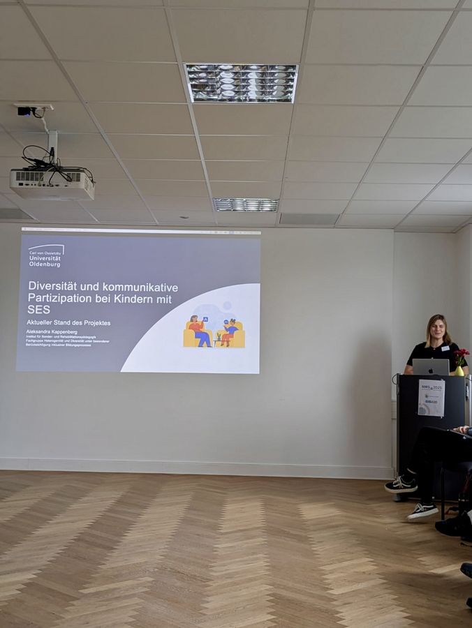 Am vergangenen Wochenende (09./10.05.2025) fand in Oldenburg die Frühjahrstagung des Arbeitskreises Empirische Sonderpädagogische Forschung (AESF) statt und drei Fachgruppenmitglieder waren mit Beiträgen vertreten. Eva Kemler (“Wer möchte schon immer so eine Verfolgerin dabei haben?” Strategien und Herausforderungen bei der Unterstützung sozialer Partizipation durch Schulbegleiter*innen) und Janina Dott (Partizipation im Fokus: Eine empirische Untersuchung zur Inklusion von Kindern in Kindertageseinrichtungen, Familie und Gesellschaft) stellten Poster zu Ergebnissen ihrer Promotionsprojekte vor. Katharina Kuhlmann hielt im Rahmen des Symposiums des Graduiertenkollegs SPARK einen Vortrag zum Thema “(Vor-)schulische Herausforderungen und soziale Teilhabe: Perspektiven von Kindern mit Sprach- und Kommunikationsbeeinträchtigungen”.