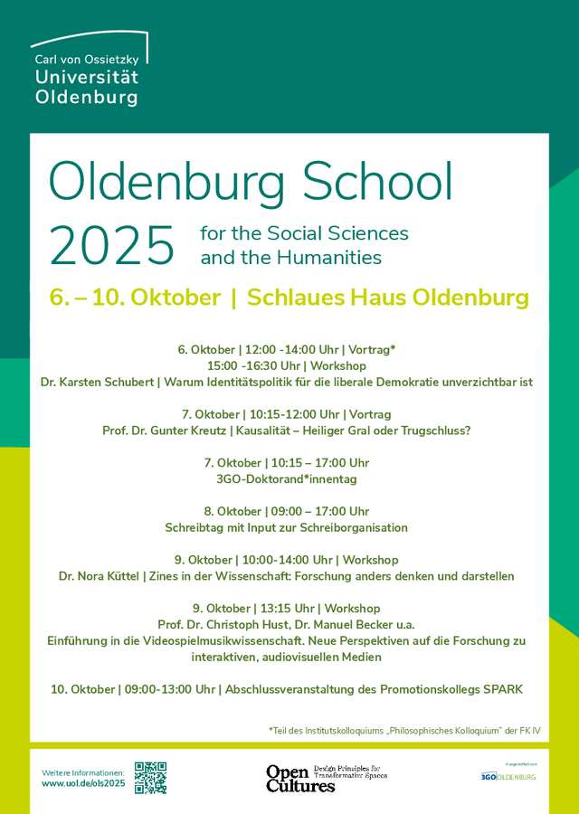 Vom 6-10. Oktober findet wieder die Oldenburg School for the Social Sciences and the Humanities im Schlauen Haus in Oldenburg statt. Los geht’s am Montag, den 6.10. mit einem Vortrag und Workshop von Dr. Karsten Schubert zum Thema „Warum Identitätspolitik für die liberale Demokratie unverzichtbar ist“. Nach dem Vortrag (12-14 Uhr), in dem zentrale Thesen aus Schuberts 2024 erschienenem Buch „Lob der Identitätspolitik“ vorgestellt werden, können die Teilnehmenden im Workshop (15-16:30 Uhr) kritische Nachfragen stellen, Bezüge zur eigenen Forschung einbringen und gemeinsam diskutieren. Die Beiträge, die unter anderem mit freundlicher Unterstützung durch die Fachgruppe realisiert werden, können auch unabhängig voneinander besucht werden. Hinweise zum weiteren Programm und zur Anmeldung gibt es hier.
