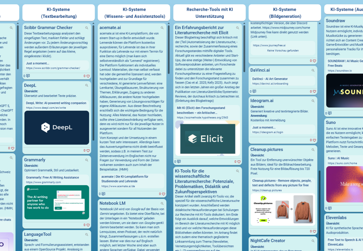 Die sehr umfangreiche Sammlung ist nach Kategorien aufgegliedert und listet beispielsweise verschiedene KI-Systeme (Textgeneration, -bearbeitung, Wissens- und Assistenztools, etc.), aber auch Leitlinien zu verschiedenen Themen, Fortbildungsmöglichkeiten, Blogs oder Promptbeispiele und noch einiges mehr auf.