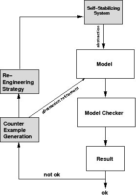 Dieses Projekt beschäftigt sich mit der Entwicklung von Methoden zur Quantifizierung und Erweiterung von Eigenschaften selbststabilisierender Systeme. Um die Entwicklung selbststabilisierender Systeme auch Nicht-Experten zu ermöglichen, müssen solche Methoden soweit wie möglich automatisiert werden. Die zugrunde liegenden Modelle für die Analyse- und die Re-Engineering-Methoden sind zeitlich-diskrete Markowketten (Discrete Time Markov Chains, DTMC) sowie zeitlich-diskrete Markow Entscheidungsprozesse (Discrete Time Markov Decision Processes, DTMDP). Ein Problem der Analyse selbststabilisierender Systeme basiert auf der Tatsache, dass die Anzahl möglicher initialer Zustände gleich der Anzahl aller möglichen Zustände ist. Daher werden Abstraktionsschemata und semantische Modelle entwickelt, um diese Probleme, die während der Analyse auftreten, zu überwinden. Es ist unmöglich, eine Prozedur zu definieren, welche die gesamte Klasse der selbststabilisierenden Systeme abdeckt. Daher werden selbststabilisierende Systeme entsprechend ihres Verhaltens klassifiziert und für die einzelnen Subklassen Beweisverpflichtungen ausgearbeitet. Weiterhin werden Fehlertoleranzmetriken zur Quantifizierung des Verhaltens selbststabilisierender Systeme eingeführt. Oft wird der avisiserte Grad an Fehlertoleranz durch mangelnde Implementierungserfahrung für selbststabilisierende Systeme nicht erreicht. Daher ist es von Bedeutung, dieses Wissen bei der Implementierung von Szenarien auszunutzen. Im Rahmen dieses Projekts werden Gegenbeispiele, die durch Analysemethoden erstellt werden, benutzt, um ein System zu überarbeiten, so dass eine spezifizierte Servicequalität erreicht wird (Abbildung). Weiterhin wird angestrebt, Heuristiken zu ermitteln, so dass der Zustandsraum eines Szenarios in einem Gegenbeispiel auf ein Modifizierungsprotokoll abgebildet werden kann um die Fehlertoleranzmetriken zu verbessern.