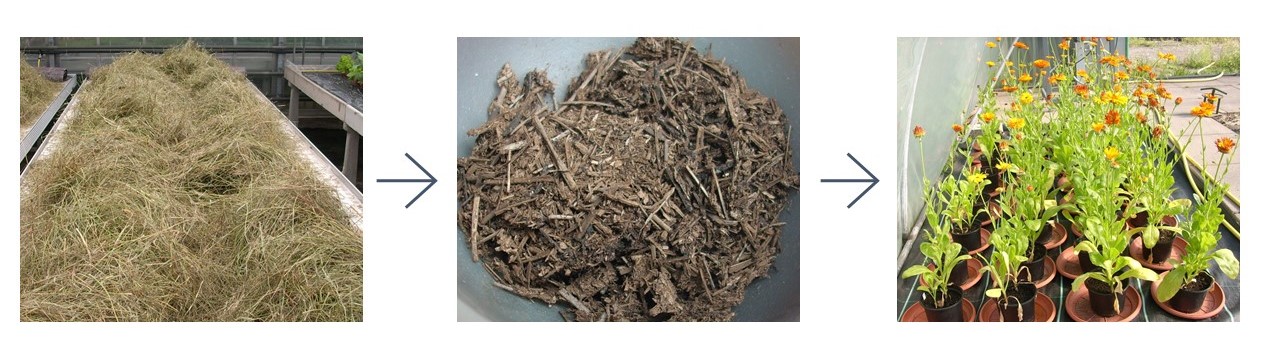 Bilder: Grasartiges Landschaftspflegematerial (links) wird in Hydrokohle (Mitte) umgewandelt. Das Hydrokohle-Kompost-Substrat im Pflanzversuch mit Ringelblumen (rechts). M. Röhrdanz