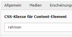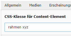 Für die Eingabe der CSS-Klasse gibt es ein eigenes Freitext-Eingabefeld CSS-Klasse für Content-Element, das sich im Reiter [Erscheinungsbild] des Inhaltselements befindet.