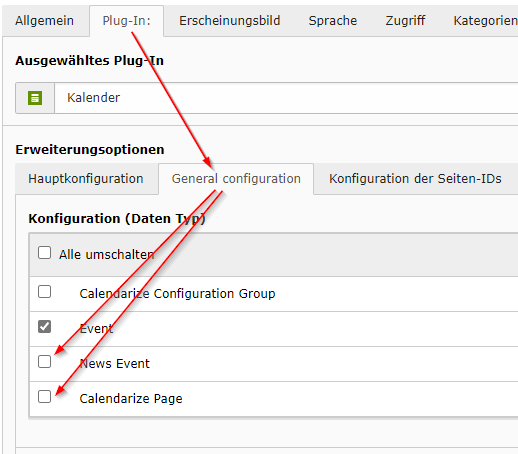 - In der Seite ein Element vom Typ "Kalender" (im Reiter Plug-Ins) erstellen und dort in den Reiter "Plug-In" → Unterreiter "General Configuration" wechseln (ist anfangs rot markiert, da es eine zwingend erforderliche Einstellung ist)