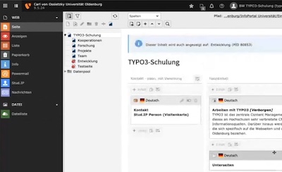 In einer Online-Schulung zum Thema "Größere Änderungen durchführen" wurde gezeigt, wie man vorgehen kann, wenn umfangreichere Änderungen an den Inhalten oder auch an der Navigationsstruktur einer Einrichtung vorgenommen werden sollen. Das Erzeugen neuer Inhalte sowie Sichern und schließlich Austauschen der bisherigen Inhalte wurde schrittweise erklärt und vorgeführt. Hier können Sie das Video anschauen.