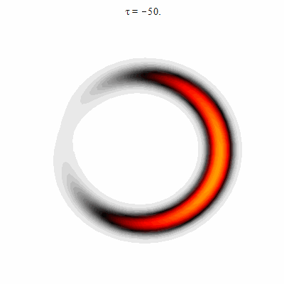 Simulated crescent-shaped photoelectron density from bichromatic (2ω:3ω) dynamic holography of Rydberg dynamics in potassium atoms