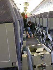 Bald bessere Bedingungen für Untersuchungen: Mitarbeiter der Arbeitsgruppe Akustik beim verkabeln ihrer Geräte in einer Flugzeugkabine. |